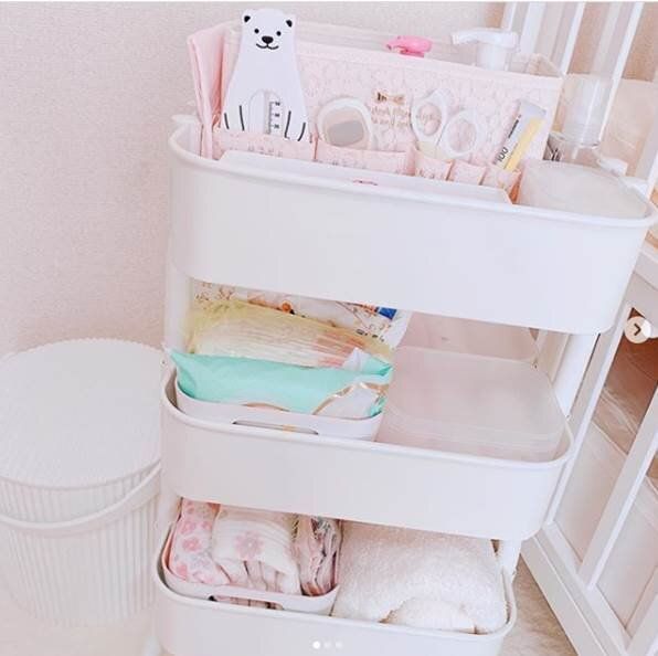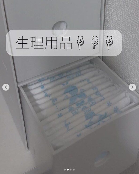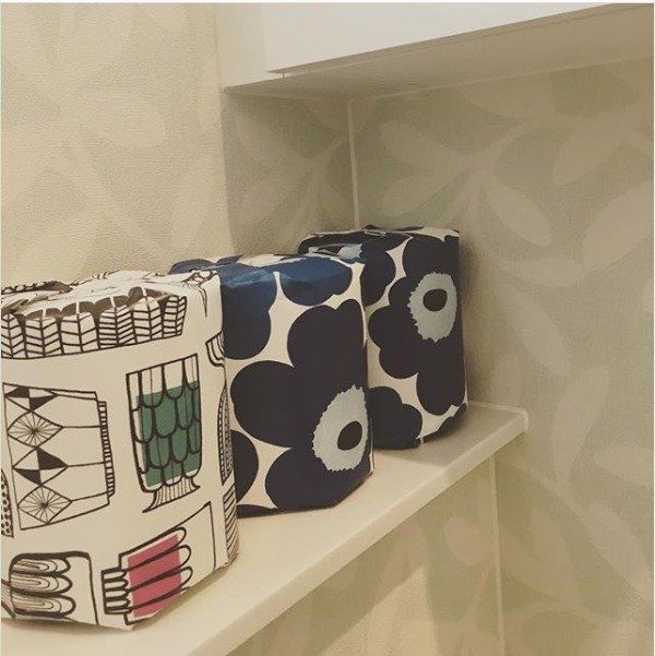 お気に入りのブランドの箱やおしゃれなボックスの中にサニタリーアイテムを入れておけば、箱を出しっぱなしにしてもおしゃれでまるでインテリアの一部のように大変身します。こちらのマリメッコの箱はなんと元々はマグカップが入っていた箱だとか。