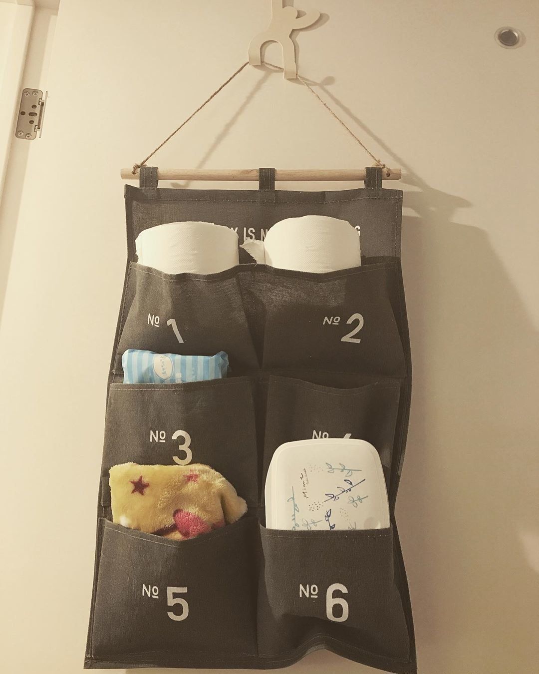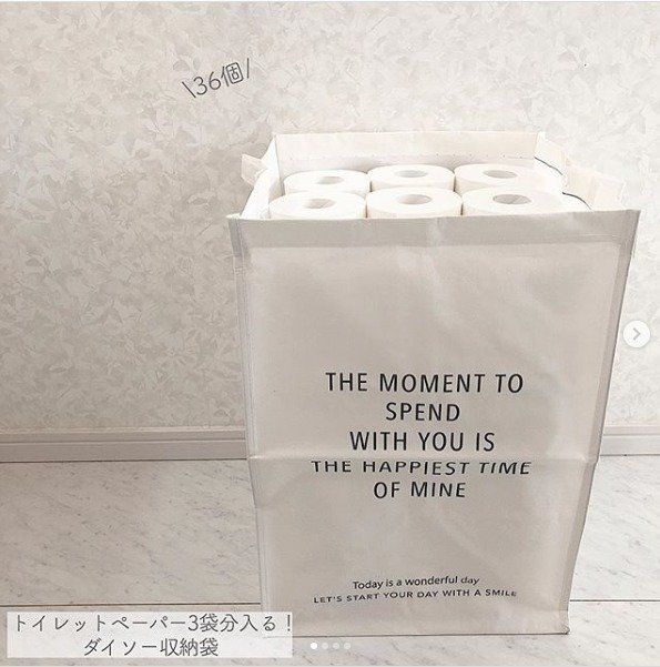 ダイソーの連結できる収納袋は、トイレットペーパーを3袋分計36個も収納できるという優れもの!これならトイレットペーパーのストックも生活感を出さずに収納しておくことが可能です。