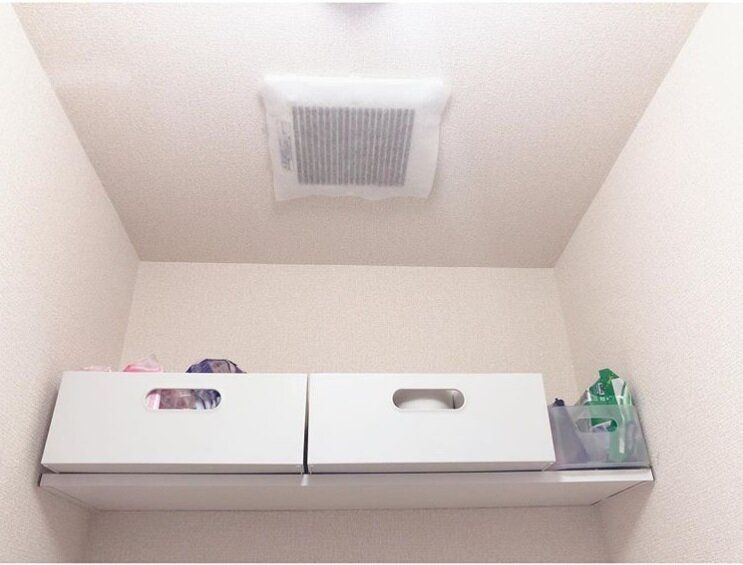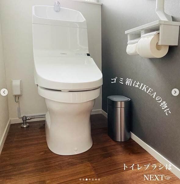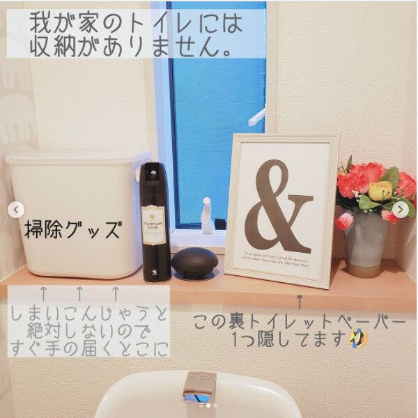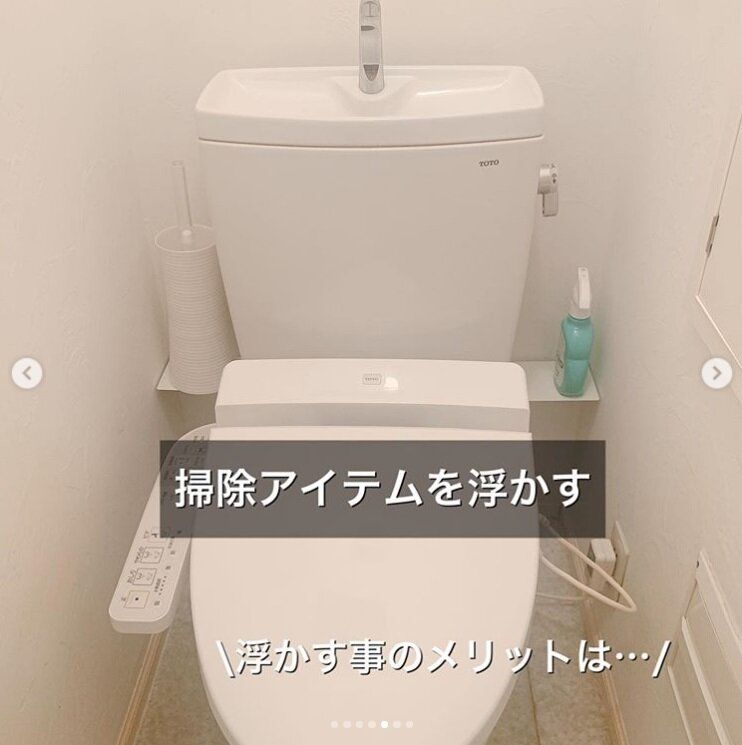 中島愛さんは、ブラシ以外の掃除用具やトイレグッズを上部の棚に収納し、床にものをほとんど置かないようにしています。そのおかげで、ペーパーや汚物入れなどもホコリをかぶることがなく、床はマットを洗って掃除機をかけ、たまに拭き掃除をするだけでOKに。子どもが床を汚したときも、サッと片づけられて楽だったそうですよ♪