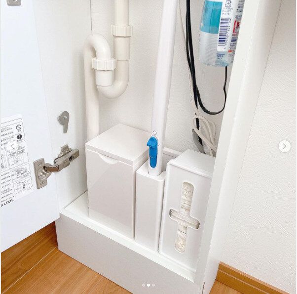 トイレにものを置きたくない場合は、トイレ近くの手洗い場下に用意しておくのもおすすめ!ボックスに入れると目隠しにもなるので生活感もカバーしてくれます。