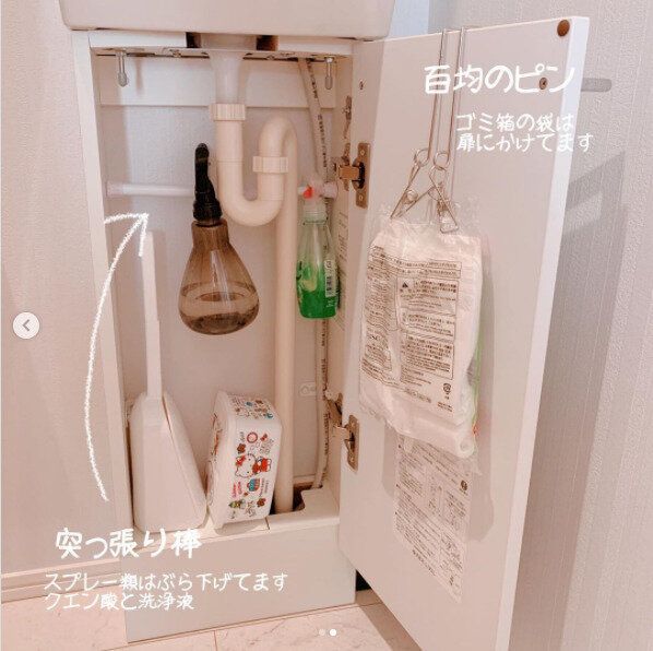 手洗い下の限られたスペースを有効活用するためには100均アイテムが大活躍します。突っ張り棒でスプレー類を浮かせ、扉にはフックでゴミ袋をかけておくことでさっと取り出すことができ、気軽に掃除をすることが可能になります。