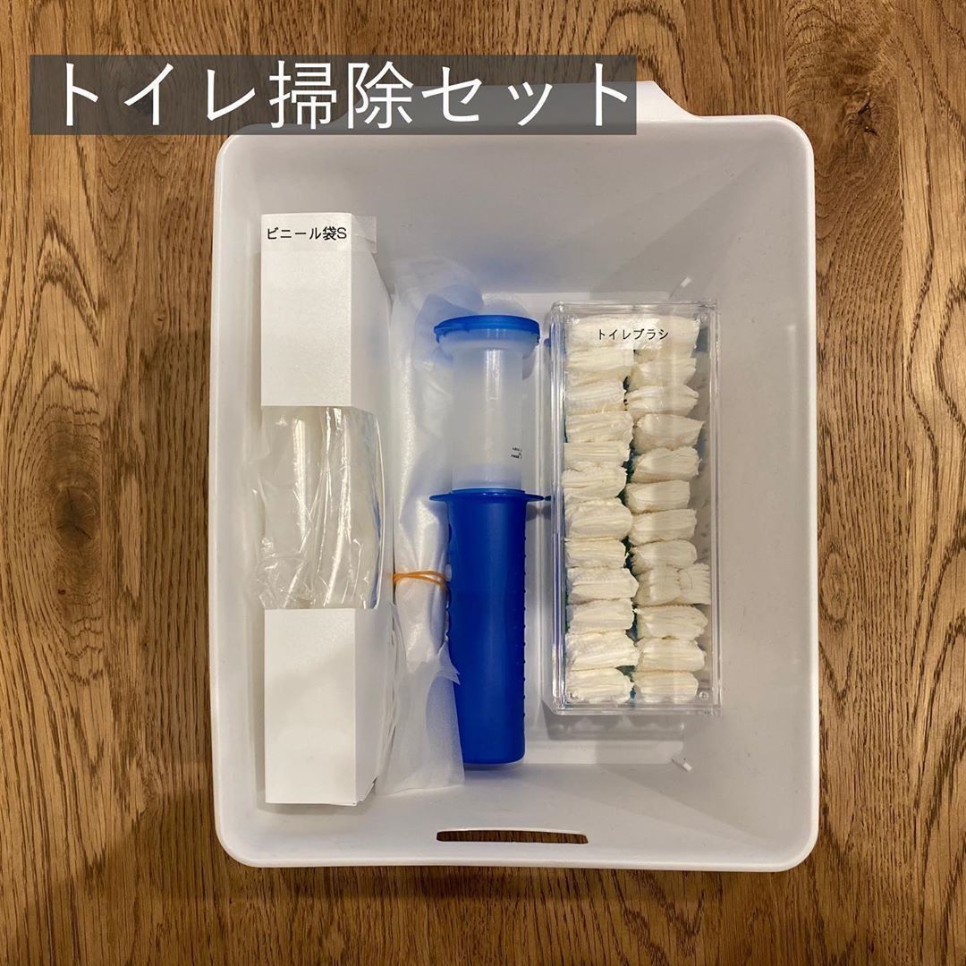 トイレ掃除グッズをひとまとめにしておくと、このボックスごと用意すればいいだけなので便利!ビニール袋もセットにしておけば最後のゴミを捨てる段階までスムーズに行えます。
