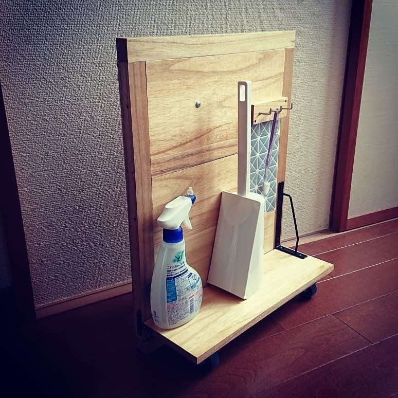 こちらのトレイはこのままひっくり返すとおしゃれな引き出し風になっているため、棚の下などに収納できます。底は台車になっているので取り出しも楽!掃除道具をまとめて置けますね。