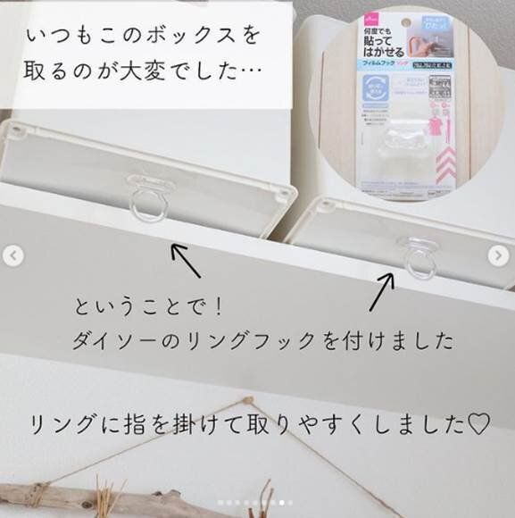 トイレの上部にある棚には収納ボックスを使うと、ストック品がたっぷり収納できて便利ですよね。ただ、背の低い人にとってはこのボックスが取りづらいんです。そこでボックスの下にダイソーの「何度でも貼ってはがせるフィルムフックリング」を取りつけたアイデアがこちら。たったこれだけでリングに指をかけて取りやすくなりました!