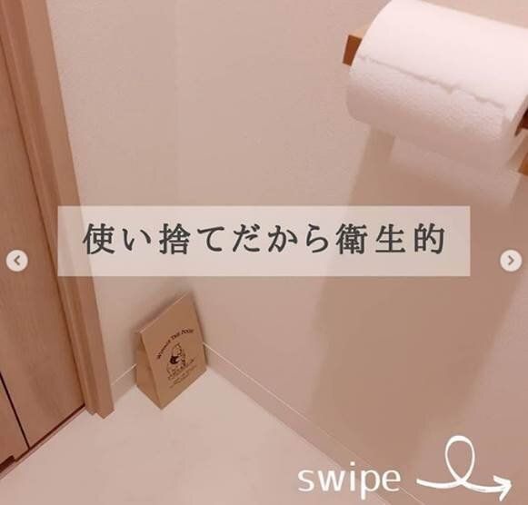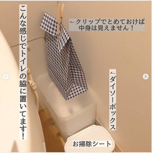 トイレに必ず置かなければいけないと思っていたサニタリーボックス。こちらはダイソーのかわいい紙袋をサニタリーボックスの代わりに使うアイデアです。置いておいても目立たず、捨てるときはこのままポイっ。これは便利ですね。