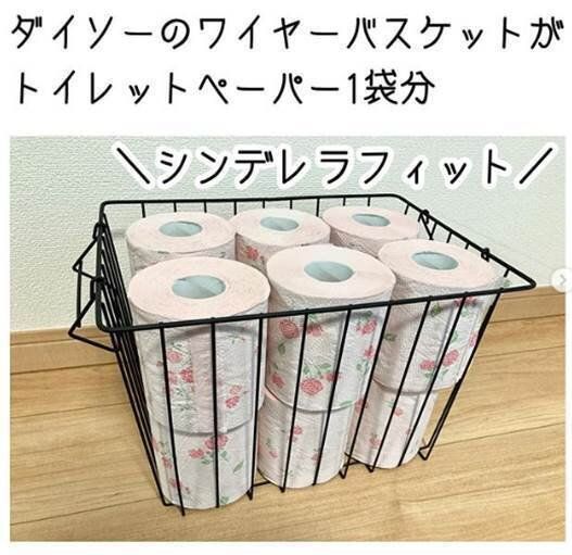 ダイソーで人気のワイヤーバスケット。こちらのサイズが、トイレットペーパー12個分とシンデレラフィット!まるでトイレットペーパーのためにつくられたかのようで驚きです。しまいこまずに、このまま置いておいてもおしゃれ!300円商品です。