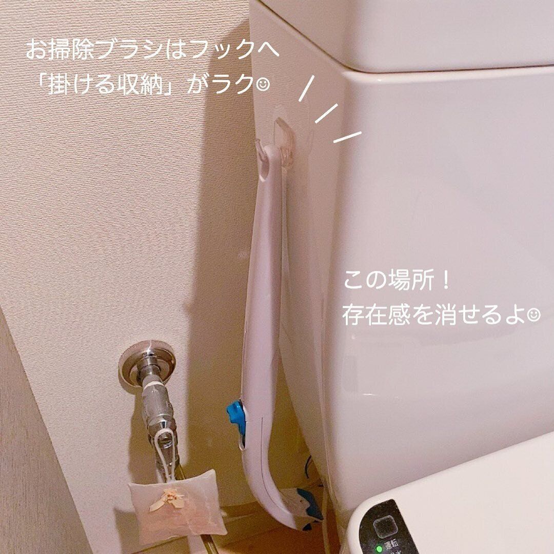 生活感がでがちなトイレブラシも便器の一部のように収納すれば見えにくく生活感がカバーできます。100均で販売されている貼って剥がせるフィルムフックを使えば吊り下げ収納が可能です。