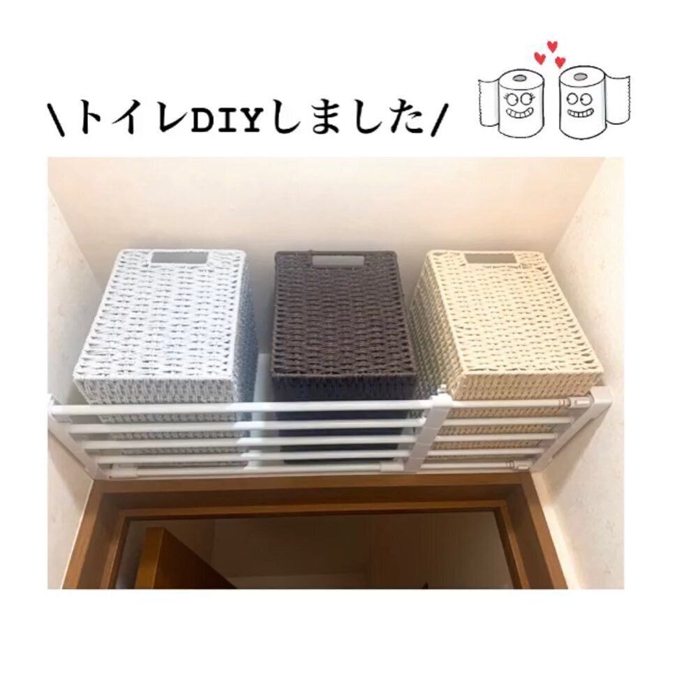こちらのトイレ棚はすべてダイソーに売っているアイテムで簡単につくれるDIY初心者にもおすすめなアイデアです。突っ張り棒なので壁を傷つけないため賃貸でも安心ですし、リメイクシートを替えればトイレの印象も気分に合わせて気軽に変えられます。