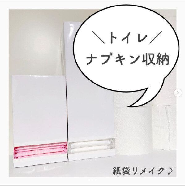 一目につかないように収納しておきたいナプキンはストッカーがあると便利ですが、わざわざ購入はもったいない。そんな人におすすめなのが紙袋をリメイクしてつくるストッカーです。制作時間もたったの10分でだれでも簡単にリメイクできるのでおすすめです。これなら丸見えにならないだけでなくホコリも被らず清潔に収納ができます。