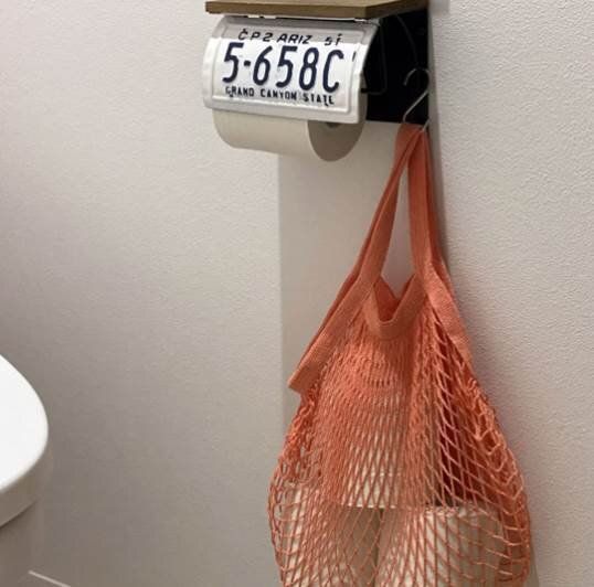 トイレットペーパーを、メッシュバッグを使って吊るす収納に。取り出しやすく、管理もしやすい!メッシュバッグのコーラルピンクのカラーが、アクセントになってとってもおしゃれです。