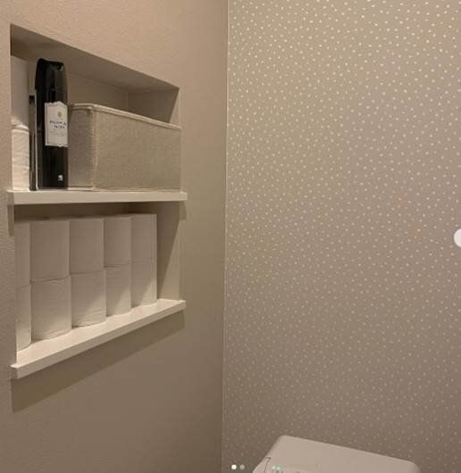 棚にしまいこむのではなく見せる収納にすることで、取り出しやすく、管理もしやすいですね。トイレ側のニッチには、トイレットペーパーを置いたり、セリアの収納ボックスを使ってトイレ用品が収納されていて、使い勝手も抜群です。