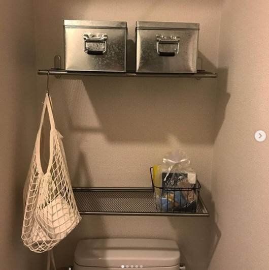 壁に取りつけられたメタリックな棚に、こちらもメタリックなボックスを使って見せる収納に。トイレットペーパーは、ネットバッグにそのまま入れてあります。簡単な収納方法なのにとってもおしゃれ。