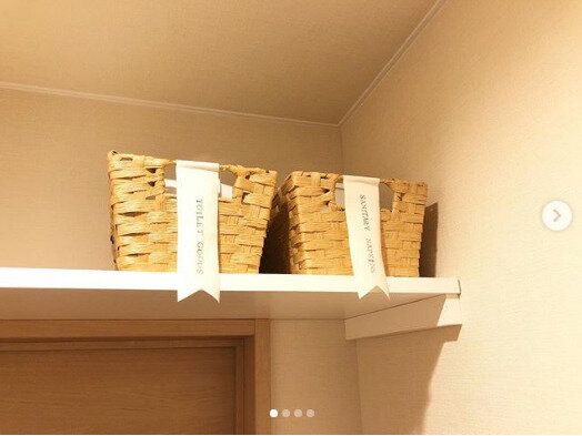 出しっぱなしにしたくないトイレ用品は、おしゃれなカゴに入れて目隠し。カゴについている少し長めのリボンは、中身がわかりやすいようにラベリングしただけでなく、高い位置にあるカゴを引っ張って取り出しやすくするという役割もになっています。