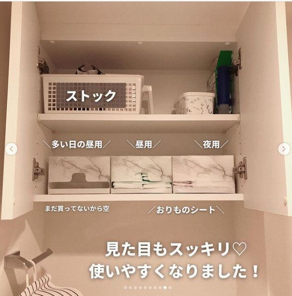 ショップなどでもらうしっかりした紙袋はひと工夫すればサニタリー収納アイテムとして大活躍。紙袋なので高さの収納スペースに合わせることができ、大容量なので多くのサニタリーアイテムをストックしておくことも可能です。