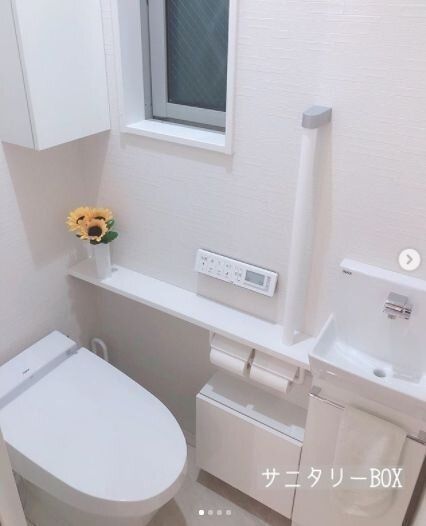 トイレに棚などの収納スペースがない場合、DIYで棚を取りつけることも可能です。サニタリー入れに使っているのはダイソーのピンクのボックス。まるでアクセサリー入れのようでおしゃれ!マグネットで開け閉めできるのも使いやすそうですね。