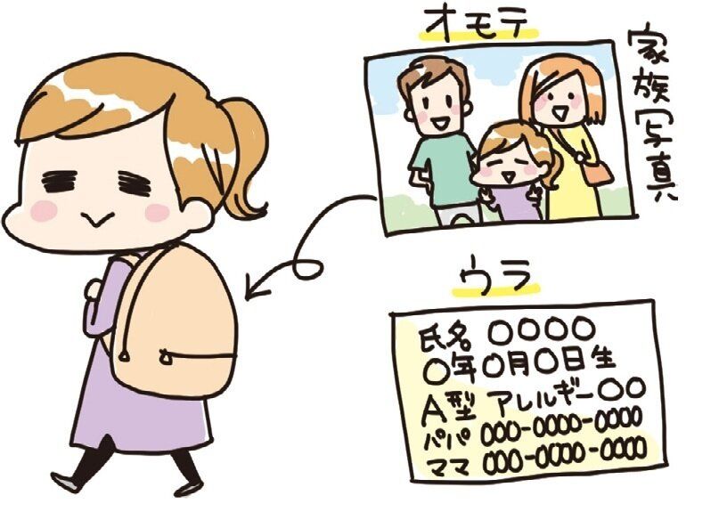 幼児の場合は迷子札をリュックなどにつけて。一緒に家族写真を入れておくと、災害時の混乱のなかでも家族に引き継ぎやすくなります。家族でいざというときの行動を決めておくのも忘れずに。