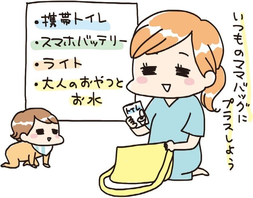 まだ歩けない子どもを抱えて重い非常用持ち出し袋を持つのは無理です。また、外出時に災害に遭う可能性を考えて、ふだんのママバッグに災害に役立つ物をプラスして。最強のママバッグになりますよ。