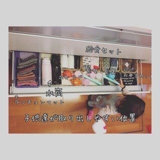 子どもが給食で使うセットは、キッチンに収納がマスト。引き戸なので、子どもでも開けやすいし、一目で何がどこにあるのかもわかります。収納の高さは、子どもの身長に合わせた場所であること。無理なく自分たちで、準備も収納もできるようになりますよ。