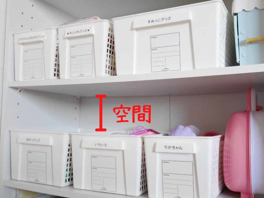 収納ケースの上に空間があると、ケースを引き出さなくてもぽいぽい放り込んで片付けられるので、子どもでも簡単に片付けができるようになりますよ。