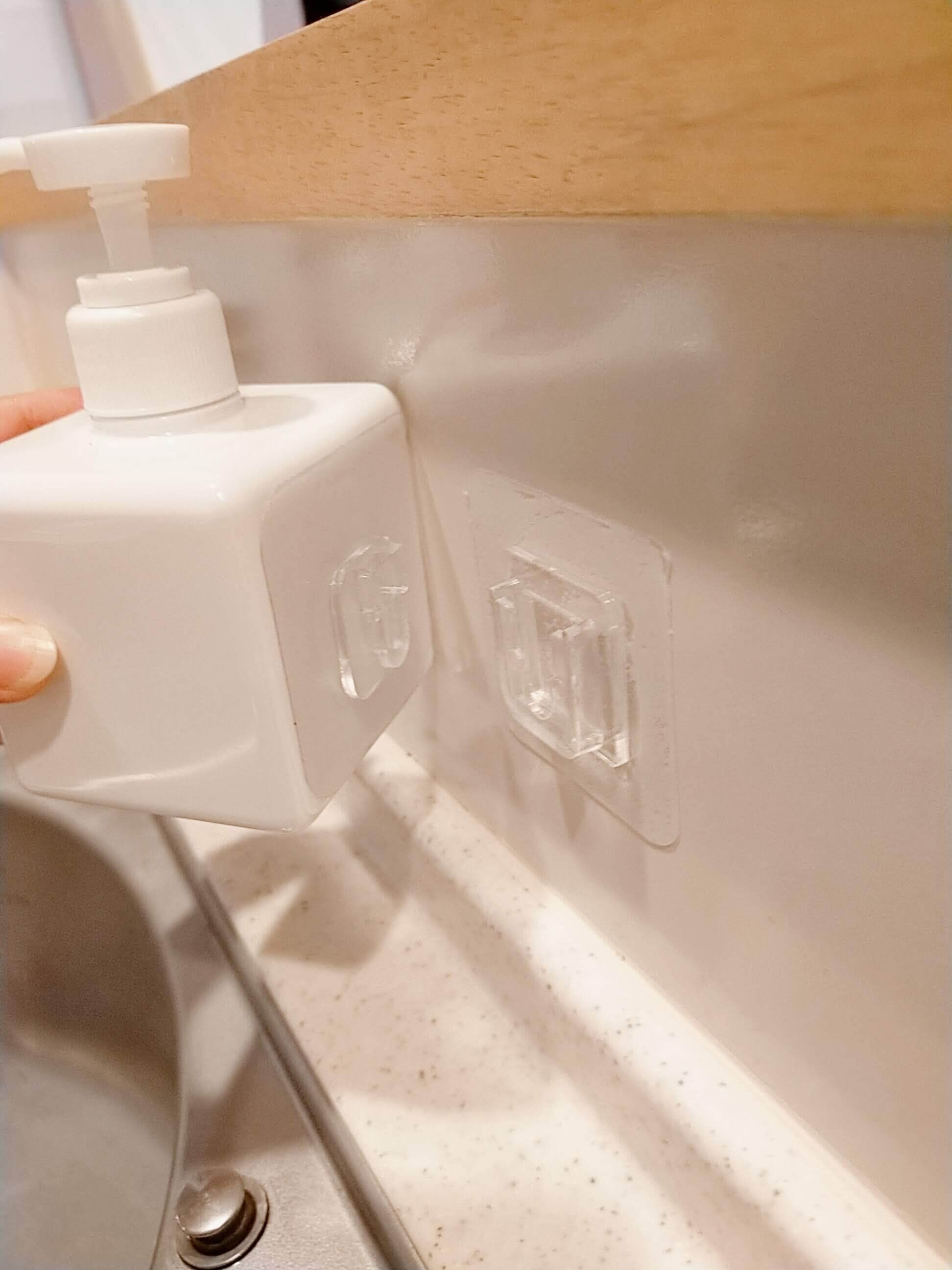 凸凹ホルダーという、貼ってはがせるアイテムを貼って浮かせてみました。見た目も良いし、掃除しやすい。掃除がキライな私にちょうどいいアイテムでした!