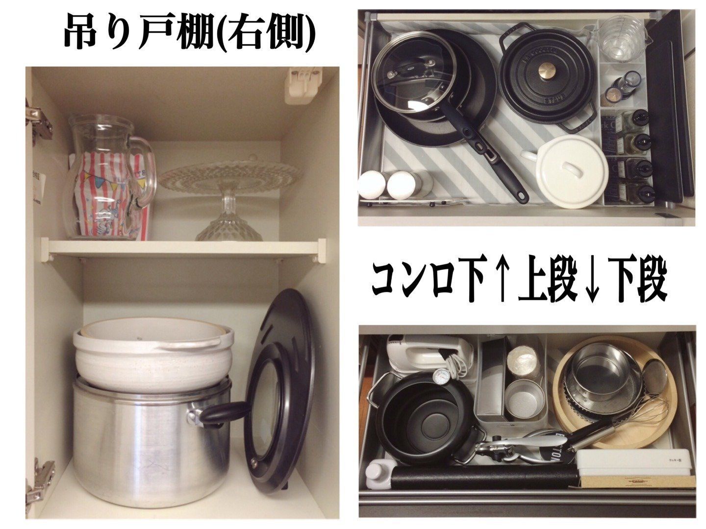 フライパンなどの大もの調理器具を、コンロ下や吊り戸棚に収納しているmaimamさん。よく使うものは下段、たまに使うものは上段と使用頻度に合わせて収納場所をかえることで、出し入れしやすくしています。ものが増えてもごちゃごちゃにならないよう、新しく調理器具を購入するときは収納も一度見直すのだとか。