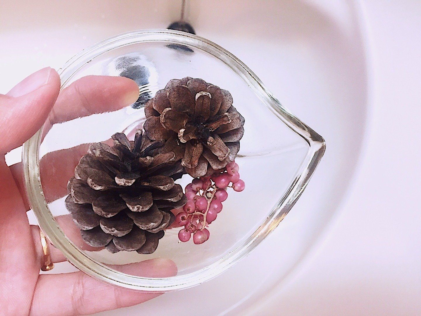 来客時にはアロマポットを、ふだんは松ぼっくりにエッセンシャルオイルをたらしたものをトイレに置いて、ニオイ対策をしているmininoさん。放射状に広がっている松ぼっくりは、数滴オイルをたらすだけで、スティックタイプのルームフレグランスと同じ効果が期待できるそう!オイルをハッカ油に変えるのもアリだそうですよ。