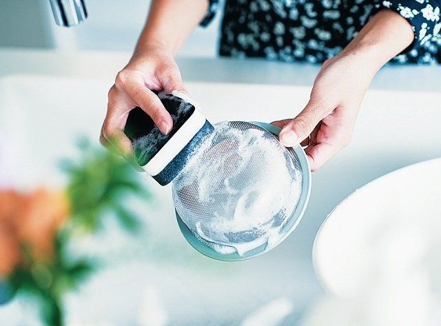食器洗いのついでに、シンク用のスポンジで排水口のゴミ受けもササッと洗ってしまいます。毎日のルーティンにすることで汚れがたまらず、「さわりたくない!」ということもなし。