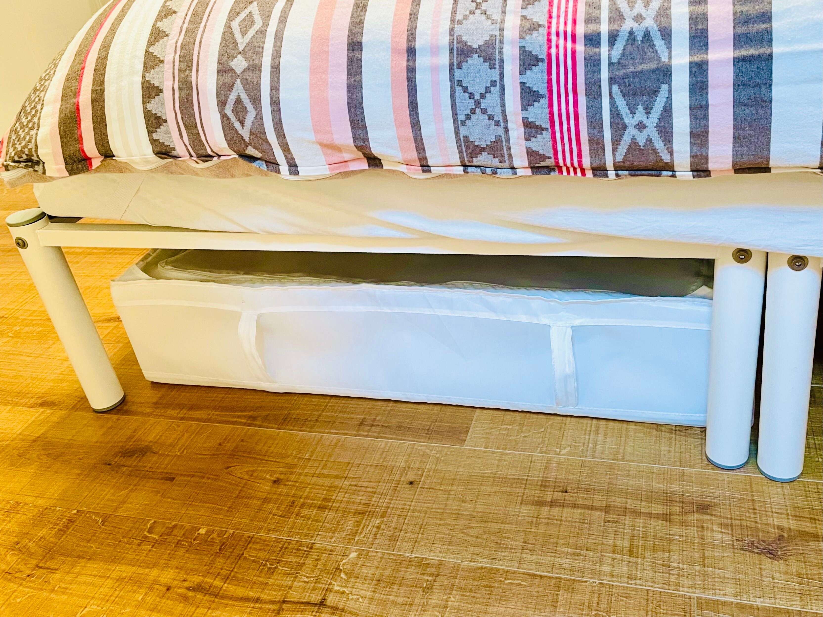 収納場所はベッドの下。オーナメントなど割れ物も入っているので、安全面を考慮して低い位置に。持ち手が付いているので、大きなボックスでも簡単・安全に出し入れできますよ。