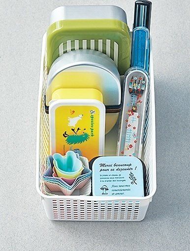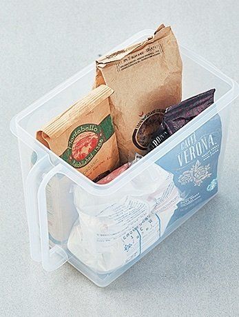 持ち手つきケースは持ち手が下までついている物が◎。粉類など重い物を入れても折れにくく長く使えます。高い場所の整理に。ふたつき。(約幅18.7×奥行き32×高さ23.3㎝)¥1,026/イノマタ化学