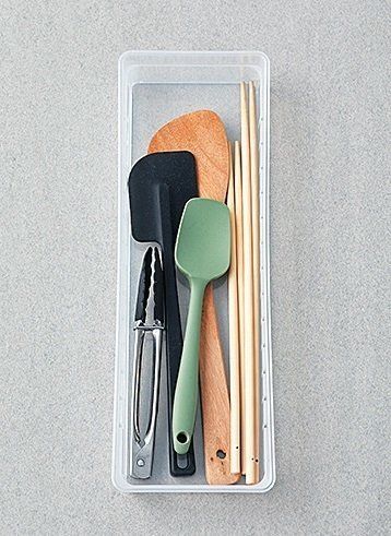 奥行きが約35㎝あり、長い調理道具もピタッと入るので、キッチンの引き出しの整理に便利。このほか、靴下や下着、くるくる丸めたネクタイを入れても◎なので、クローゼットの引き出しにも使えます。約2㎝刻みで動かせる仕切りつき。(約幅12×奥行き34.8×高さ5㎝)¥108/イノマタ化学