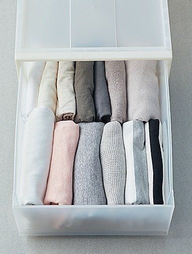 各社で販売されている衣装ケースは高さが数種類あり、衣類に合う物を選ぶと◎。迷ったら中くらいの高さの24㎝タイプを。シャツも厚手のトレーナーもしまえます。(約幅40×奥行き65×高さ24㎝)¥1,490/無印良品