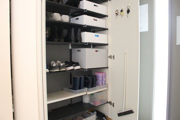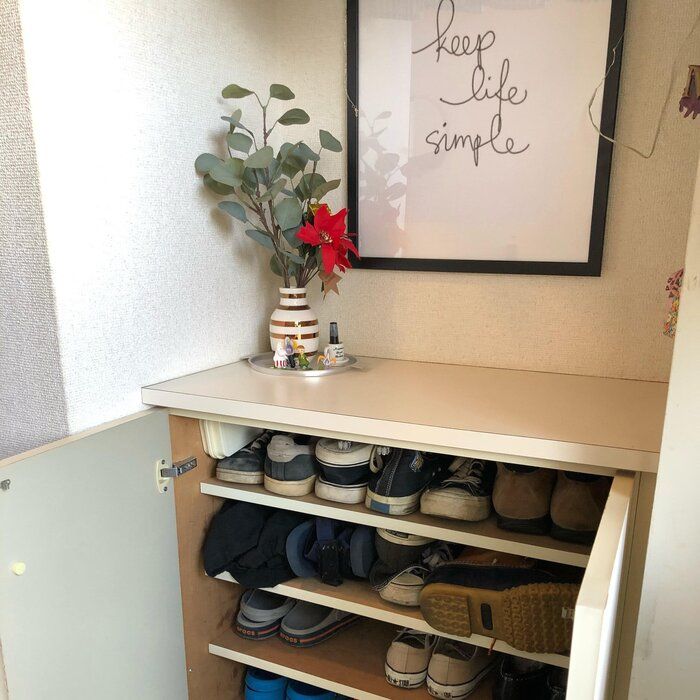 サンキュ!STYLEライターmihoさんは、靴箱の扉にほうきを吊るし収納しているようです。掃除道具はすぐに取り出せるように収納し、いつでも「ついで」に掃除できるようにしておけば、玄関掃除も毎日続けやすいといいます。掃除用具は靴箱の中に収納して、玄関をスッキリ見せているのだとか。