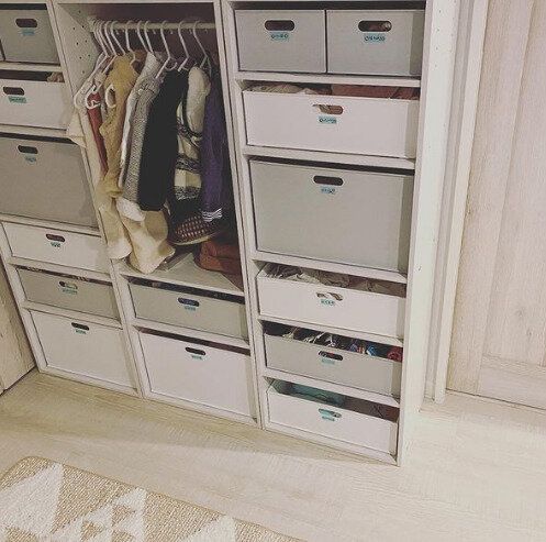 5段のカラーボックスを組み合わせれば、何かと増えるベビー関連のものをまとめて収納するのにぴったり!収納ボックスに合わせて仕切りの高さを変えたり、仕切りをはずしてつっぱり棒を取りつけてハンガー収納にしたりとアイデアがいっぱいです。とっても使いやすそう!