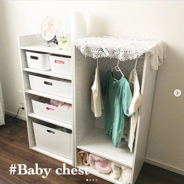 アイリスオーヤマのチェストとハンガーラックを組み合わせてベビークローゼットを作成している例です。赤ちゃんが成長してからも使えそうな収納力がありそうですね!