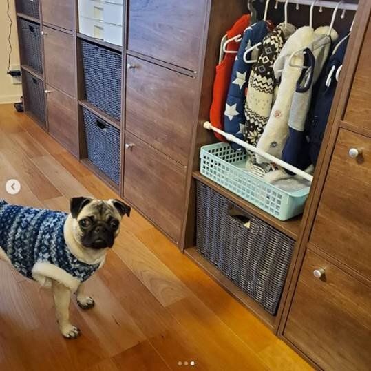 愛犬のかわいい洋服がたくさんあって収納方法に困っている人も多いはず。こちらはカラーボックスの棚を1枚抜き、つっぱり棒を使って愛犬のための洋服収納スペースにしたアイデアです。ワンちゃんのこの満足そうな顔!これは使い勝手もよく、まねしたくなるアイデアですね。