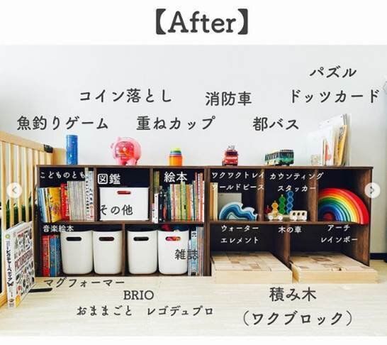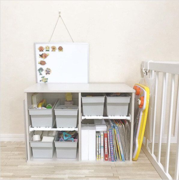 素敵な収納ボックスに変身!実はここにはおもちゃが収納されているそうです。カラフルなおもちゃは見た目にもゴチャゴチャしがちですが、これならとってもおしゃれ!ストレージボックスならおもちゃが取りだしやすく、片づけやすいのもいいですよね。