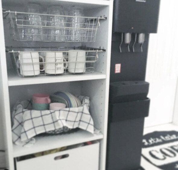カラーボックスは棚として単体で使うというイメージが強いですが、こちらではキャビネットの中に入れて仕切りとして使っています。シンデレラフィットするものを探すのも◎。
