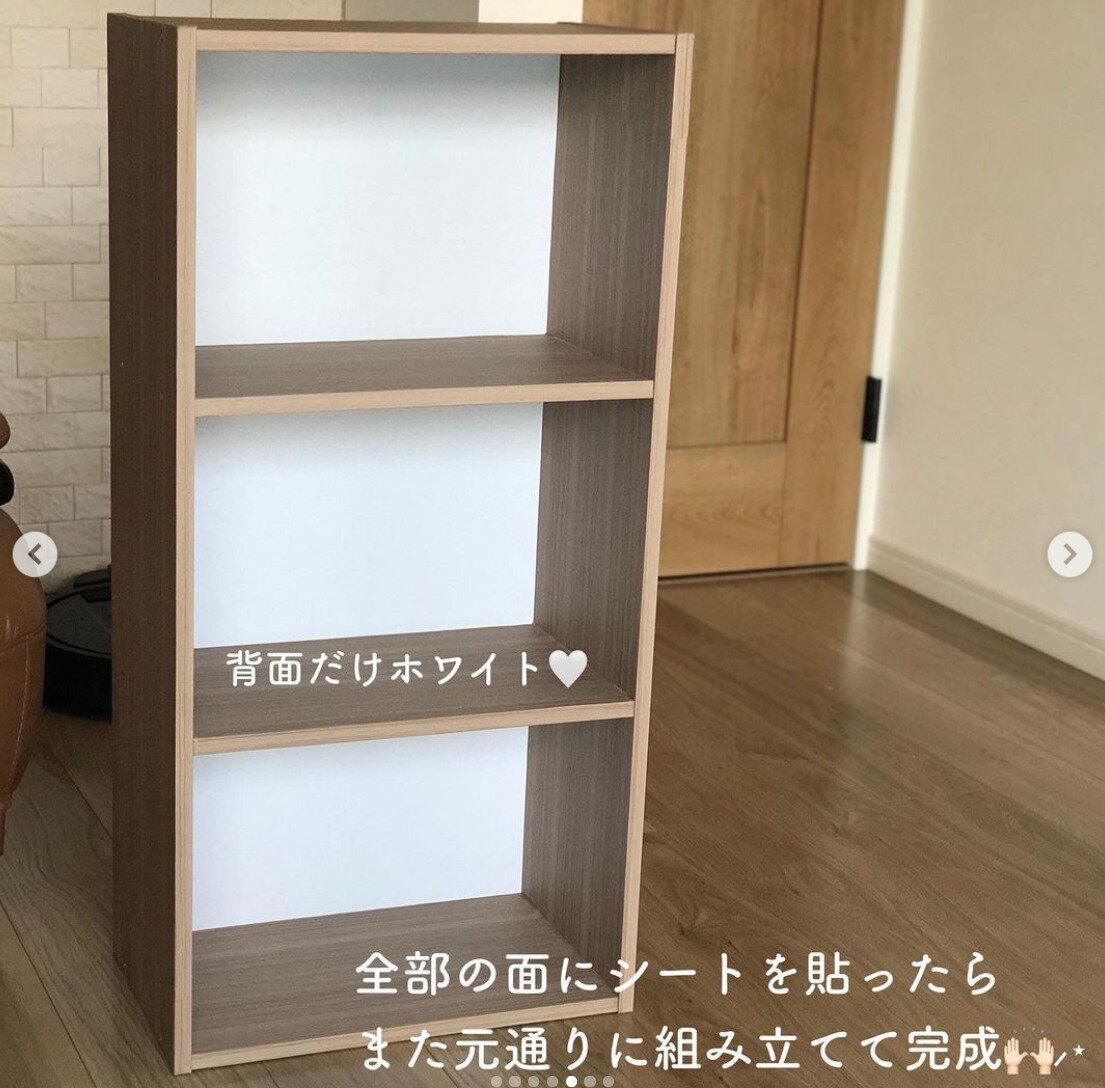 こちらは、ダイソーの木目調リメイクシートを使用したDIYアイデアです。背面のみホワイトのシートを使用していて、より高級感のあるナチュラルなカラーボックスに。リメイクシートを使えばキズをカバーでき、気分転換にもなるのでおすすめですよ。