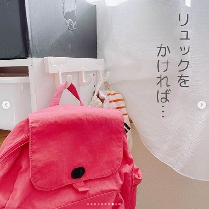 リュックをひっかけているフックは「カラーボックス用3連フック」です。カラーボックスのネジをゆるめて、このフックを引っかけるだけで取りつけは完了。簡単にカラーボックスの収納を増やすことができるんです。これは便利ですね!