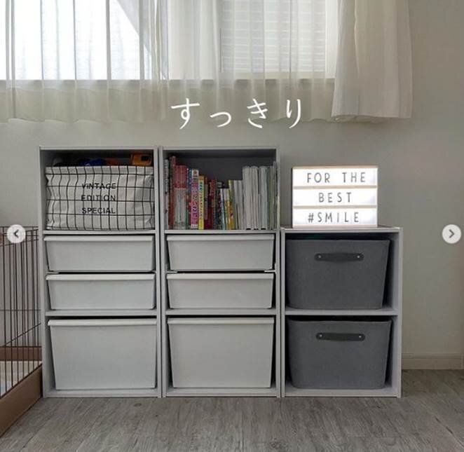 グレーカラーの収納ボックスでおもちゃ収納がすっきりみえる