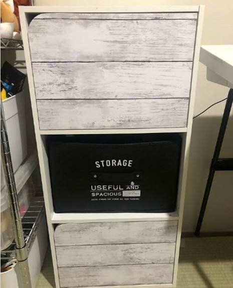 リメイクシートを貼るだけでカラーボックスの印象がこんなに変わります。真ん中にはダイソーのストレージボックスを合わせることでカッコよさもアップ!収納力も増え、使い勝手も抜群です。