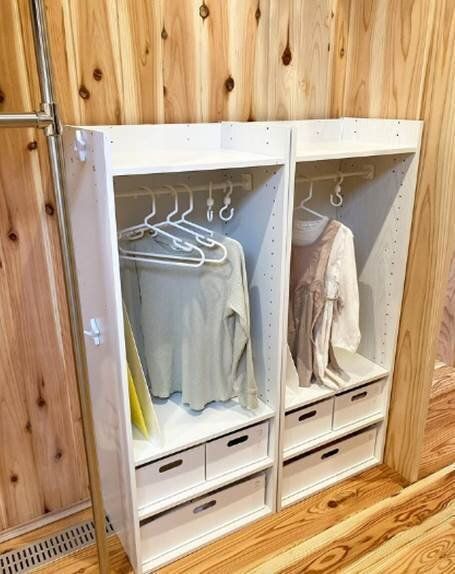 カラーボックスにつっぱり棒を取りつけることで子どもの「お仕度コーナー」が完成。小さな子どもでも洋服に手が届きやすく、「自分でお着がえをしたい!」という気持ちまで応援してくれそうですね。