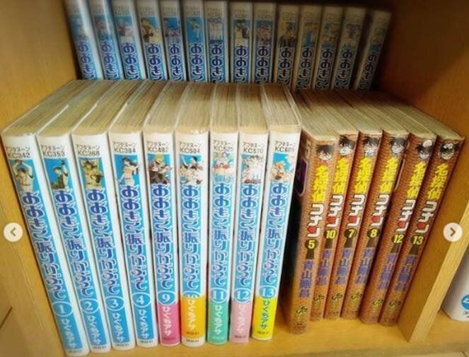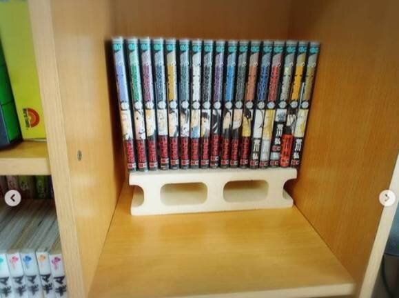 その秘密がこちら。発砲スチロールでできたダイソーの「ミニレンガ」を後列の漫画の下に置くアイデアです。これで奥行きのあるカラーボックスを100%使うことができますね。