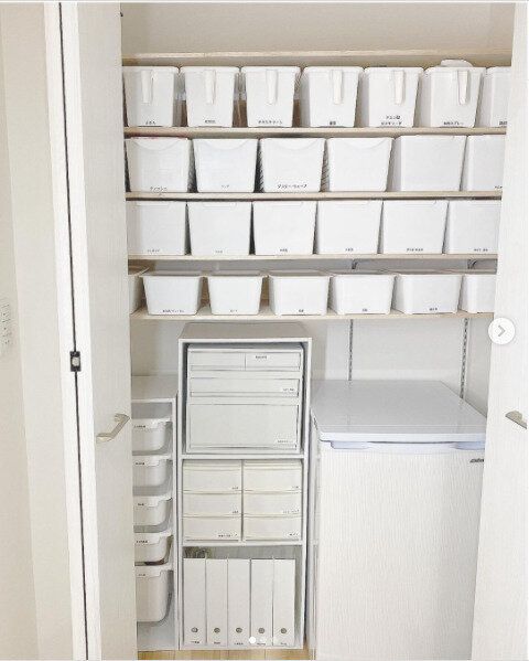 パントリー内の収納をホワイトカラーで統一し生活感のないすっきり収納にしています。またパントリー内にカラーボックスを活用し、カラーボックス収納もホワイトで統一することでまるでつくりつけ収納のような印象になります。セリアのホワイトカラーのファイルボックスは生活感の出やすい書類をすっきり見せてくれるのでおすすめです。