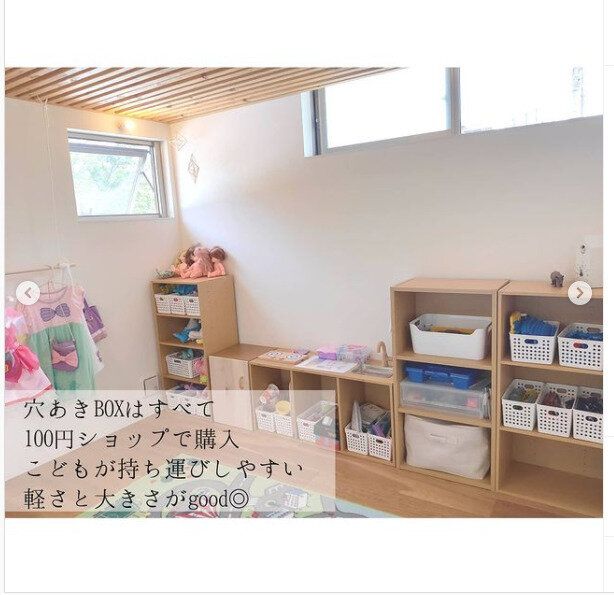 カラーボックスに子どものおもちゃを収納するアイテムとして穴あきタイプのボックスを使えば、小さな子どもでお持ち運びしやすくなります。穴あきボックスは軽量で大きさも子どもが持てるサイズとなっているのでお片づけの際にも役立ちそうです。