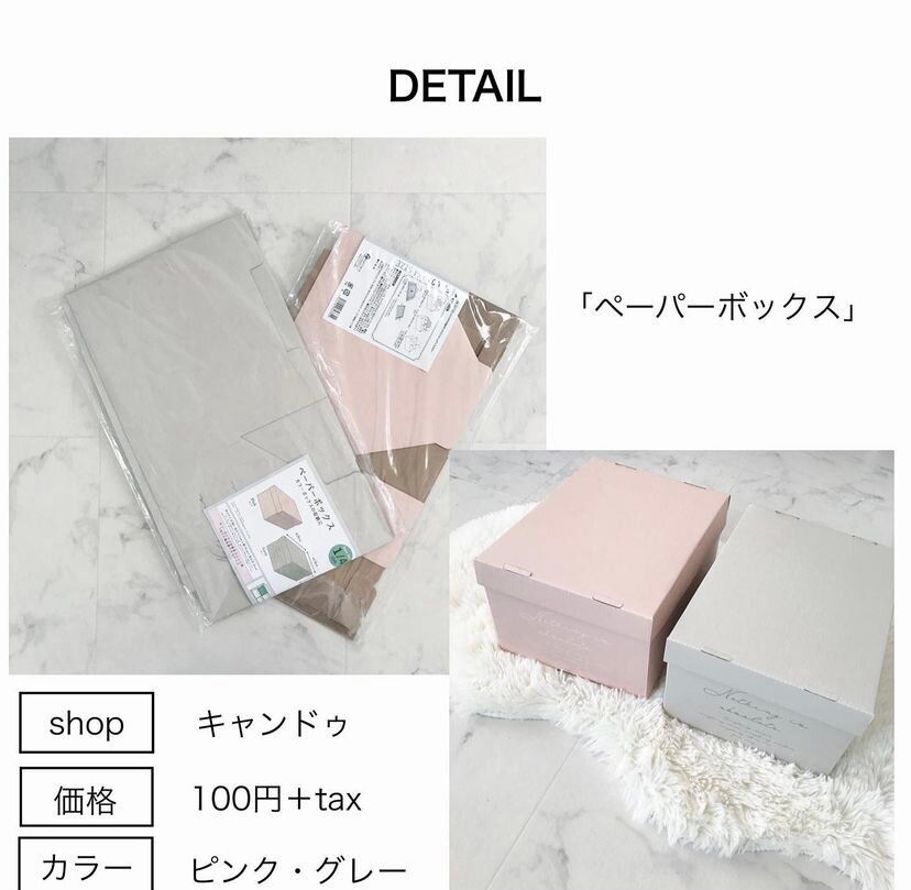 淡い色がとてもかわいいニュアンスカラーのペーパーボックスです。カラーボックスに収まるサイズで、ふたつきなのもうれしいポイントですね。110円には見えないおしゃれなデザインのペーパーボックスなので、インテリアにもなりますね。