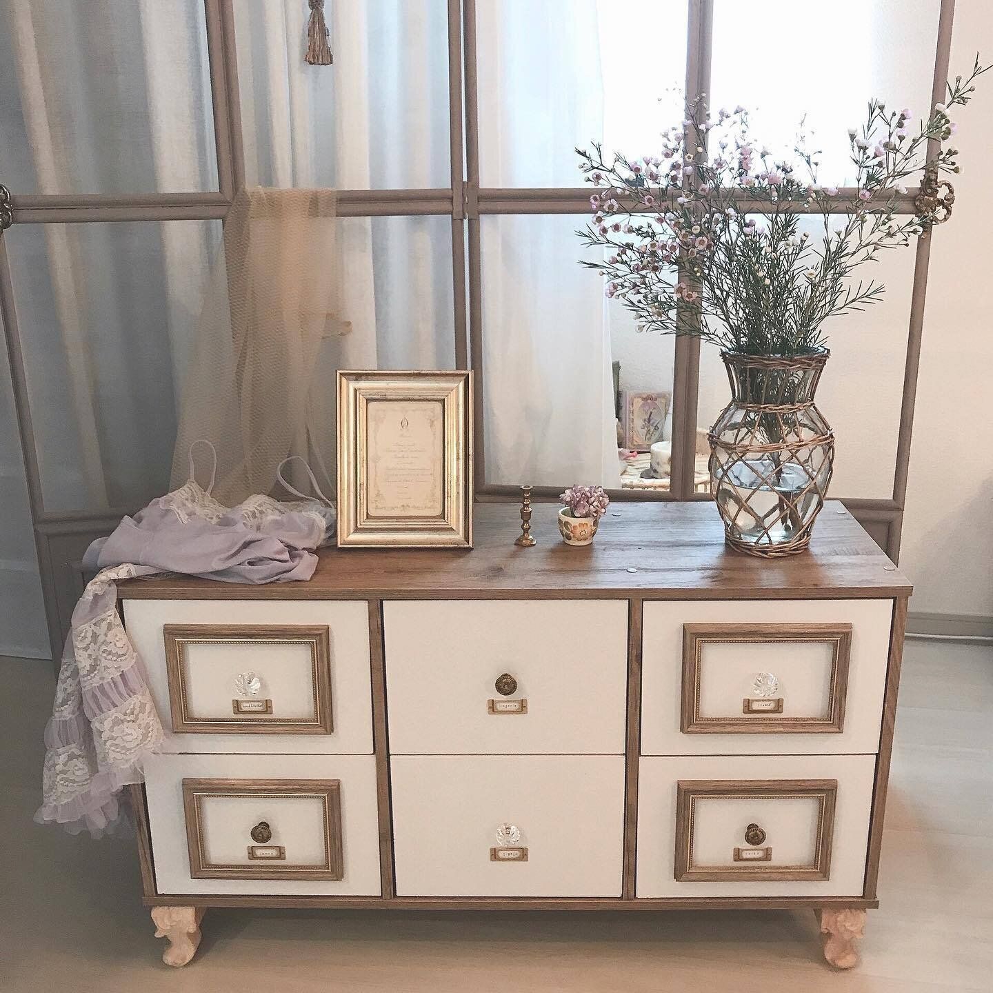 こちらは元々はニトリのカラーボックスだったものをアレンジしたキャビネット!ゴールドの金具などを取りつけることで一気に高見えキャビネットに♪