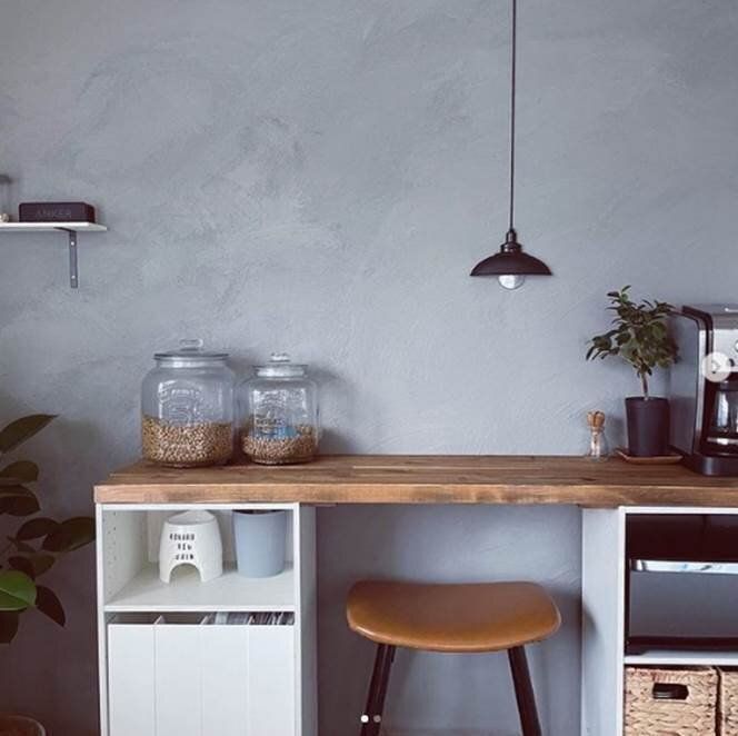 カラーボックス2個に天板を取りつけて素敵なコーナーが完成しました。キッチンの横にこういったスペースがあると、キッチンカウンターとしてもワークスペースとしても使えて便利ですよね。落ち着いたカラーの天板も雰囲気にぴったりです。