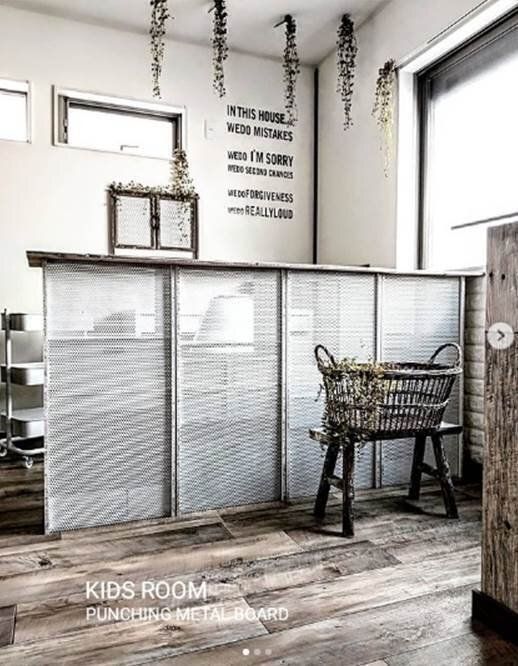 部屋をゆるやかに間仕切っているのはカラーボックス。背板をぬいてパンチングメタルボードをとりつけたアイデアです。裏側はもちろん収納としても使えます。お部屋の雰囲気にぴったりでとっても素敵ですよね!