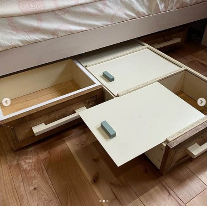 ナチュラルな木の風合いが部屋の雰囲気にぴったりなベッド下収納。じつはこちらもカラーボックスをリメイクしたものなのです。